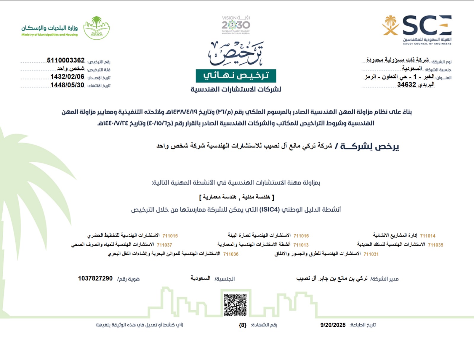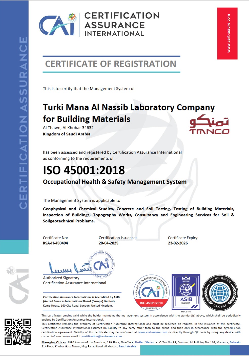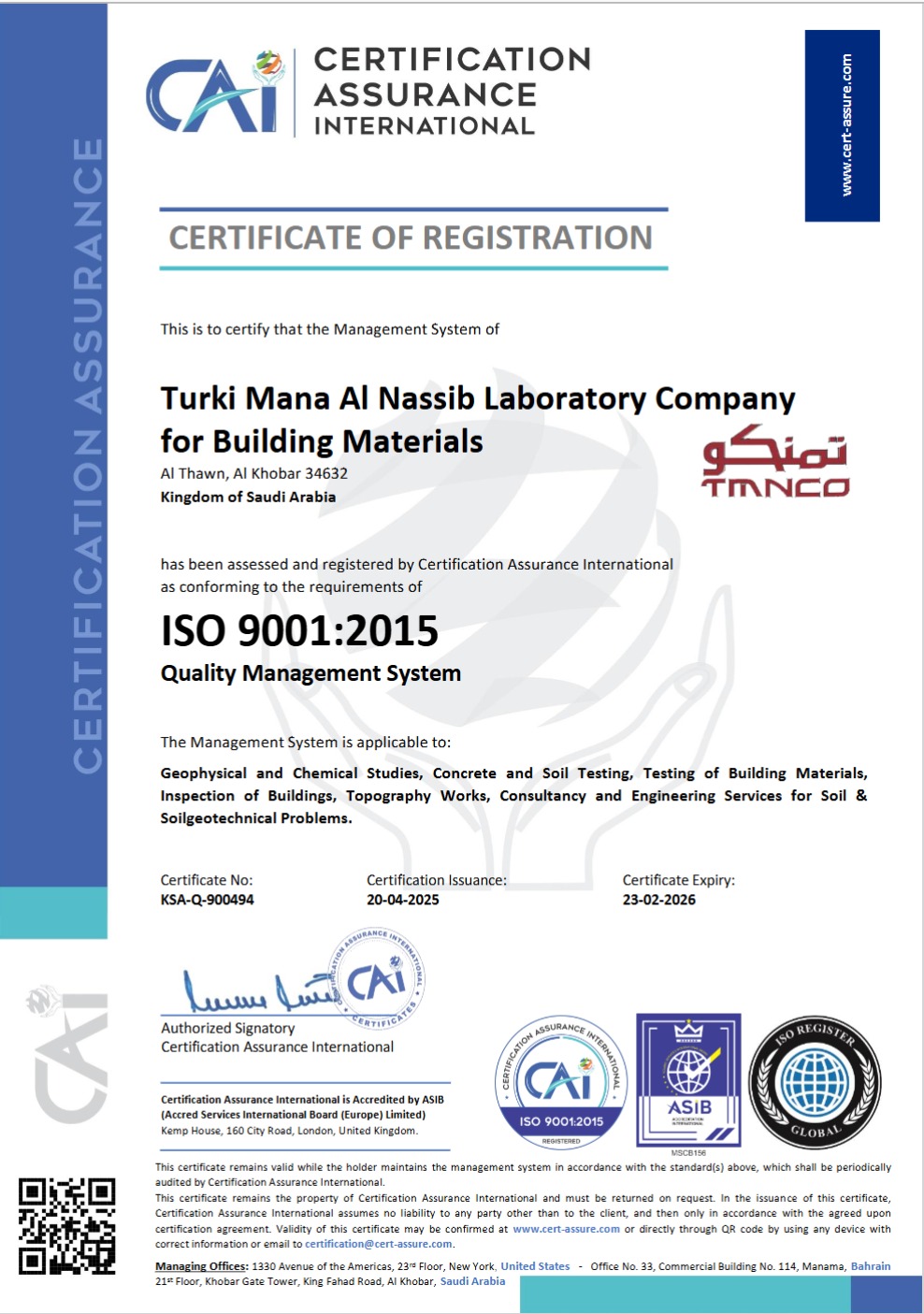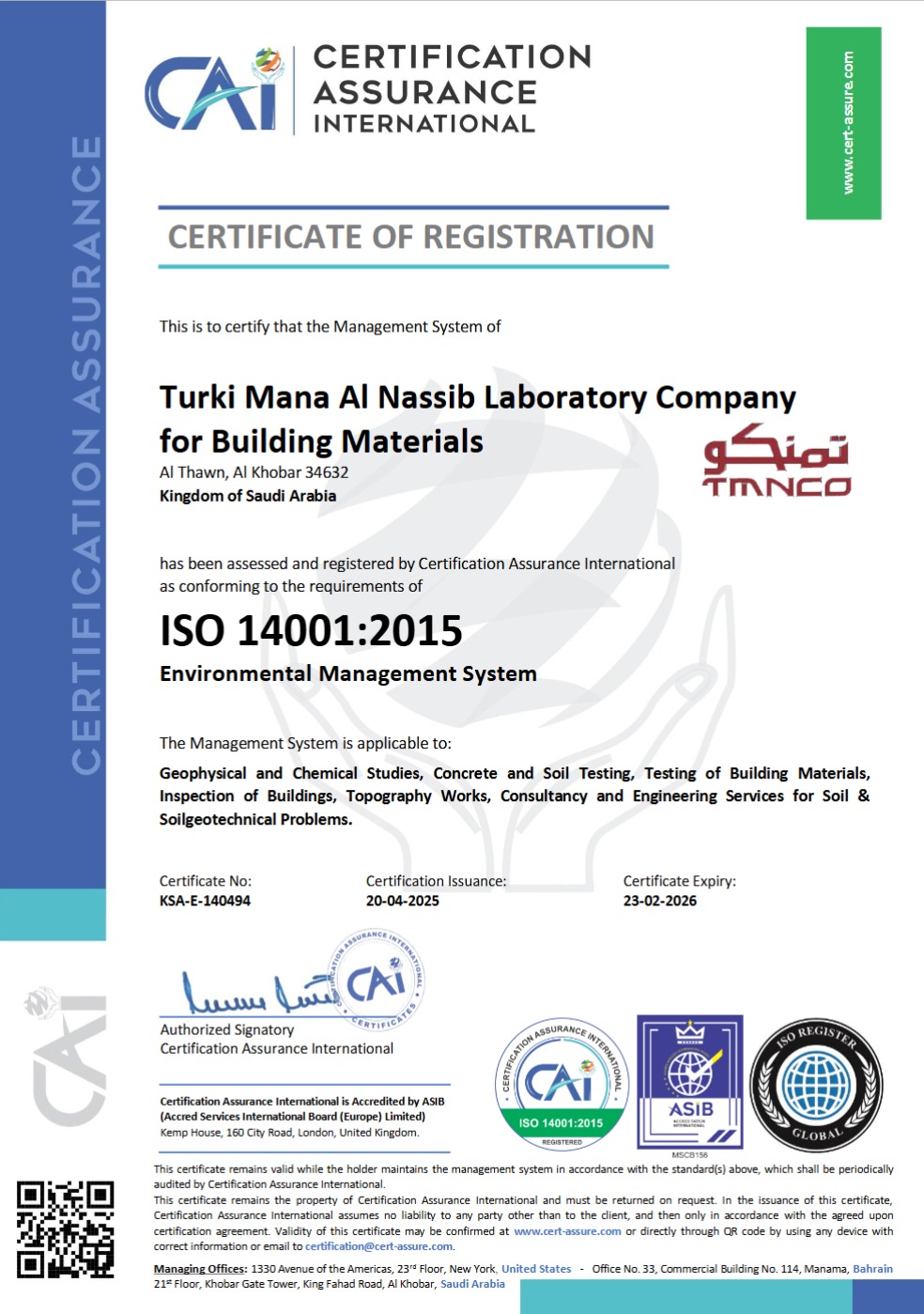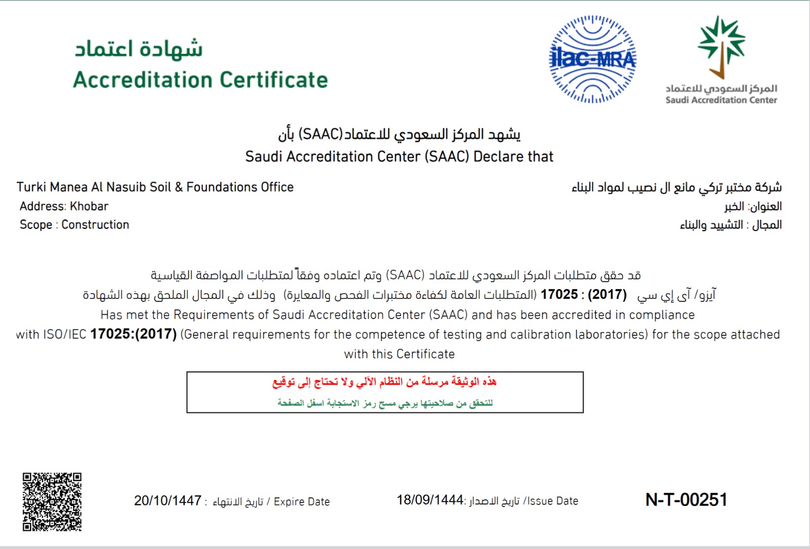 geotechnical studies, and engineering services supporting project development and execution. The company operates under a quality system compliant with ISO/IEC 17025 and is accredited by the Saudi Accreditation Center (SAC) under Accreditation No. (00251). TMNCO also holds an Engineering Consultancy License issued by the Saudi Council of Engineers under License No. (5110003362), enabling the company to deliver integrated engineering services that support both design and construction phases of projects.